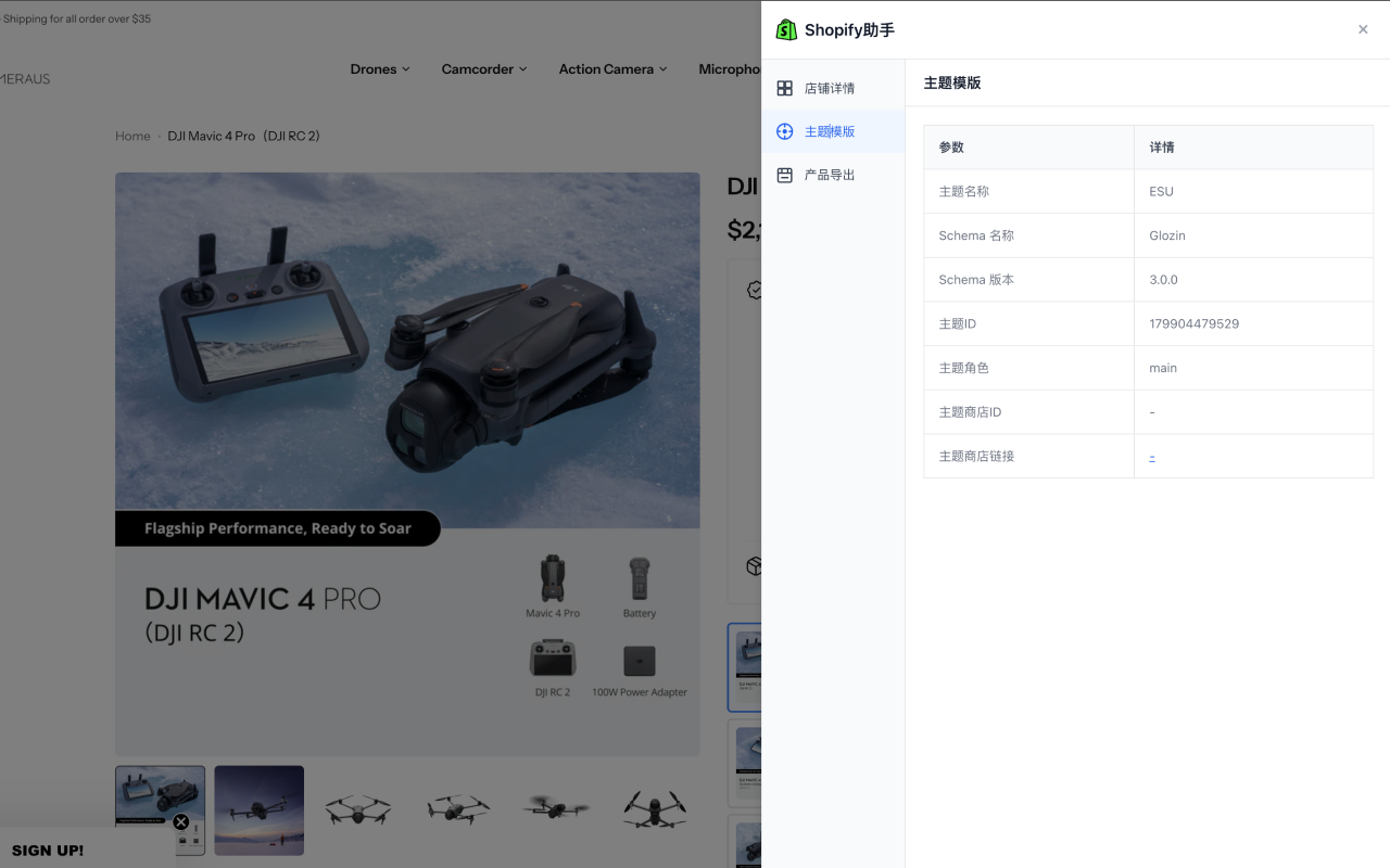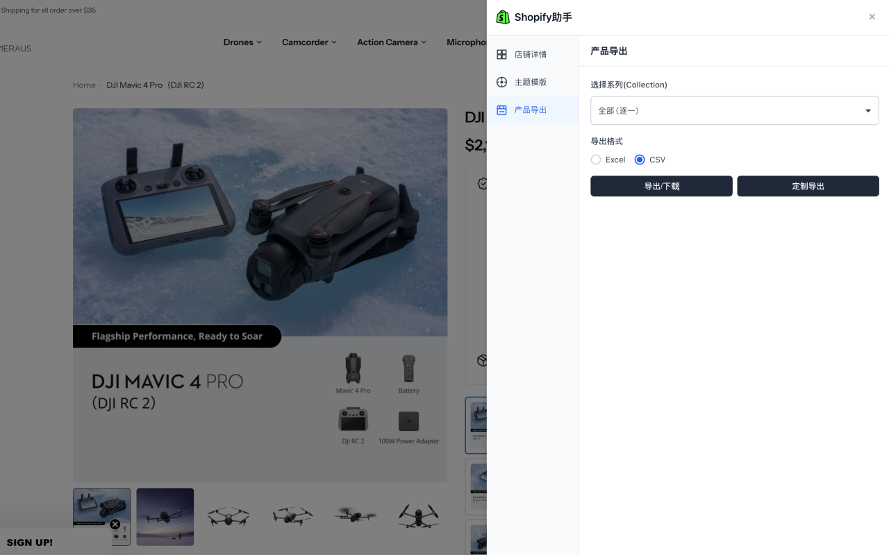 Shopify 店铺数据分析工具,一键导出产品数据,查看店铺详情和主题信息。